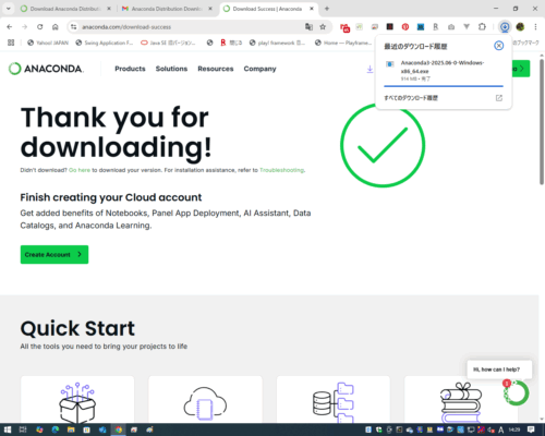 チェックが入っていると完了後にAnacondaの「Thank you for downloading!」ホームページが開きます。