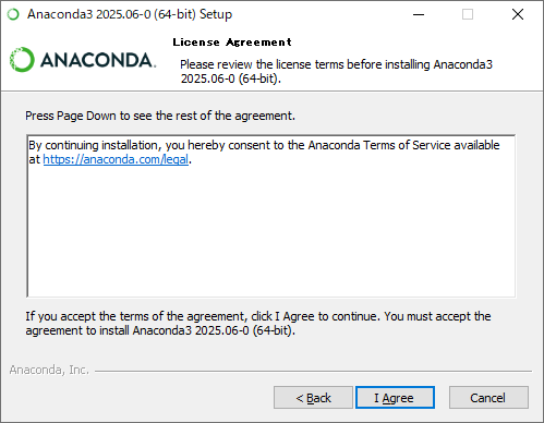 インストールを続行することによりhttps://anaconda.com/leqalに掲載されている Anaconda の利用規約に同意したことになります。