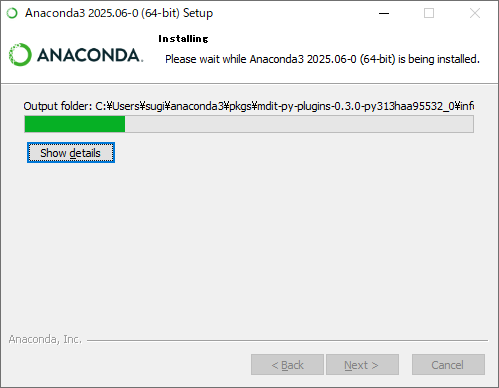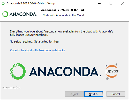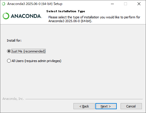 ダウンロードした「Anaconda3-2025.06-Windows-x86_64.exe」を実行します。