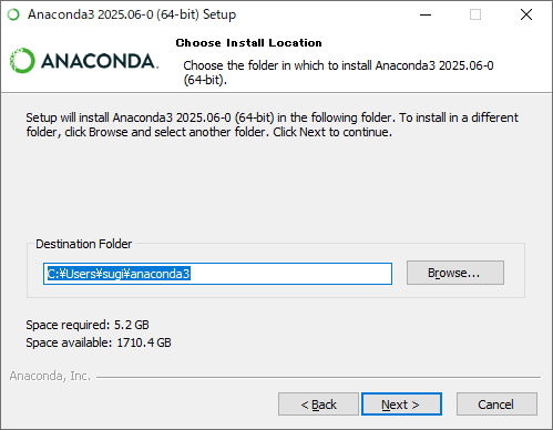 ディフォルトで、C:\Users\[ユーザー名]\anaconda3 になっています。