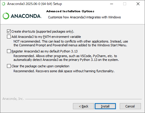 このオプションは非推奨なのでチェックオフにします。 - Register Anaconda3 aw my default Python 3.13