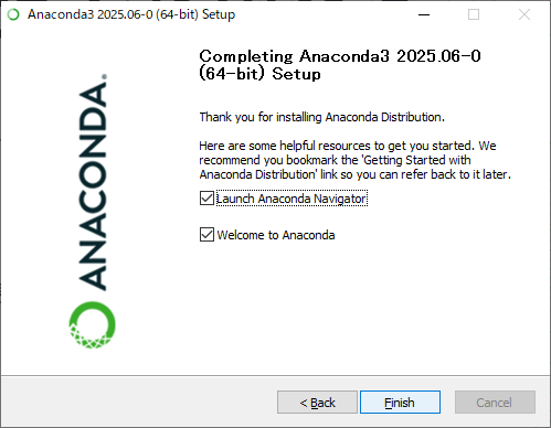 「Launch Anaconda Navigator」にチェックが入っているとAnaconda Navigatorが起動します。