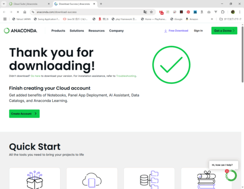 「Welcome to Anaconda」にチェックが入っているとAnacondaの「Thank you for downloading!」ホームページが開きます。