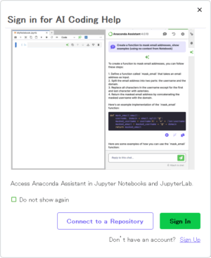 Anaconda起動するとすぐに「Sign in for AI Conding Help」というダイアログが開きます。