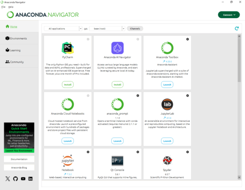 Anacondaは統合型なのでPython本体と開発ツールのJupyter NotebookやSpyder、開発環境構築やメンテナンスを行うAnaconda Navigatorなど、開発するための便利なツールがオールインワンで同梱されています。