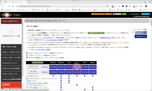 「Windows x64」の「C/C++」の[Download]ボタンをクリックするとダウンロードが開始されます