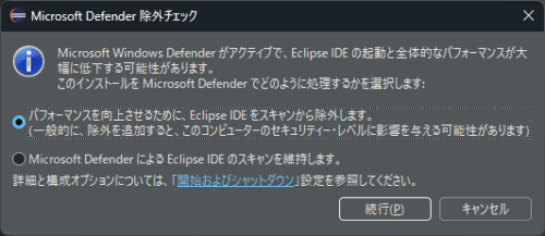 パフォーマンスを優先したかったので、「パフォーマンすを向上させるために、Eclipse IDEをスキャンから除外します。」を選択しました。
