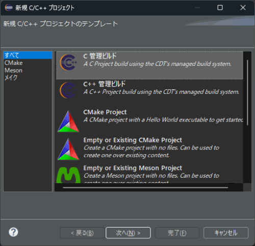 「新規 C/C++ プロジェクト」ダイアログで「C管理ビルド」を選択し[次へ]をクリック