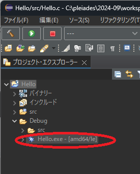 左側のプロジェクト・エクスプローラーを展開して、「Debug」の中にある「Hello.exe」を表示させます。