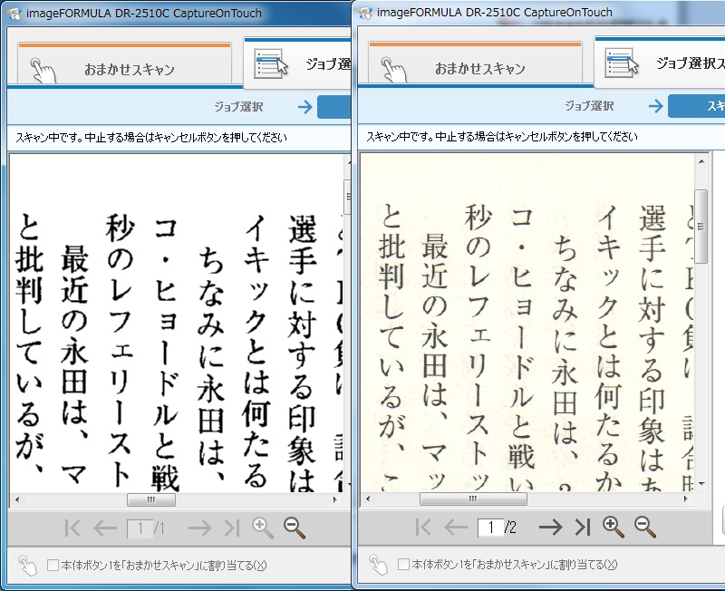 カラー白黒探知というモードもありますが、ページによって文字の感じが違ってしまうと見づらくなるので、カラーモードに統一しています。