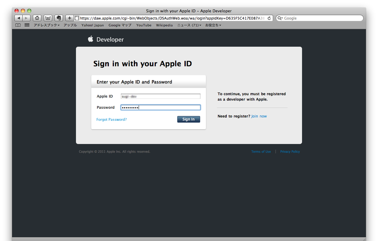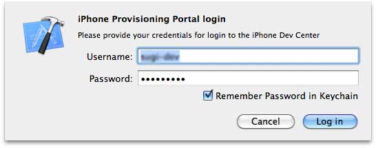 ここで入力するUsernameとPasswordは、iOS Dev Centerにログインするときのやつを使います。