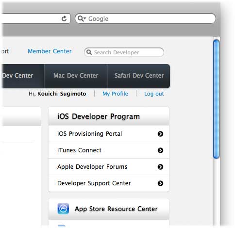 では、おなじみのiOS Dev Centerから作業を始めます。