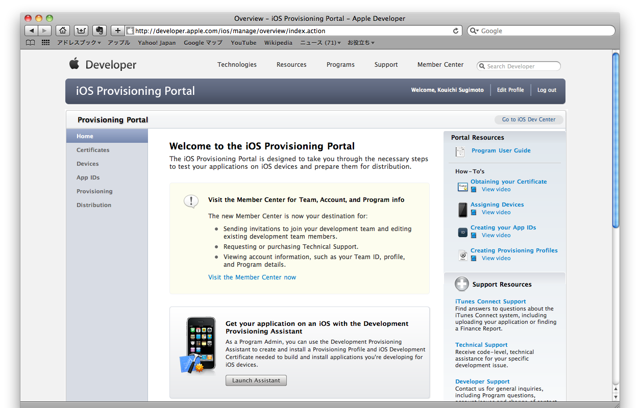 やっとたどりついたiOS Provisioning Portal画面(^^;