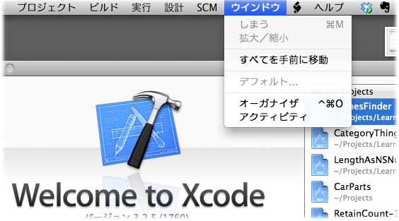 Xcodeを起動し、メニューから[ウインドウ]-[オーガナイザ]を選択します。