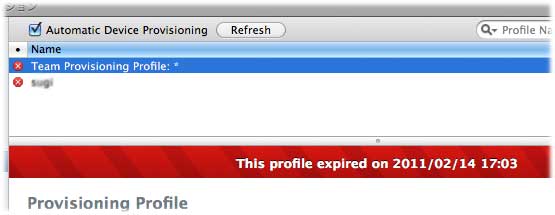 以前からプロビジョニングプロファイル期限切れ間近の警告がでていましたが、2月14日に期限切れを迎えました。