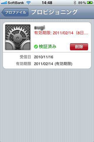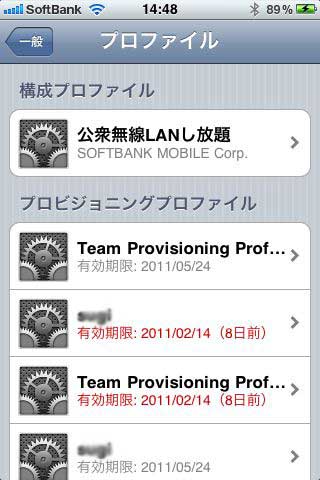 iTunesで同期をとった後のiPhoneのProvisioning Profileの画面です。