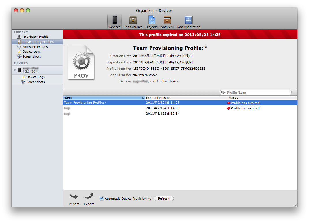 オーガナイザ画面の左メニューから「Provisioning Profiles」を選択すると、この画面が表示されます。
