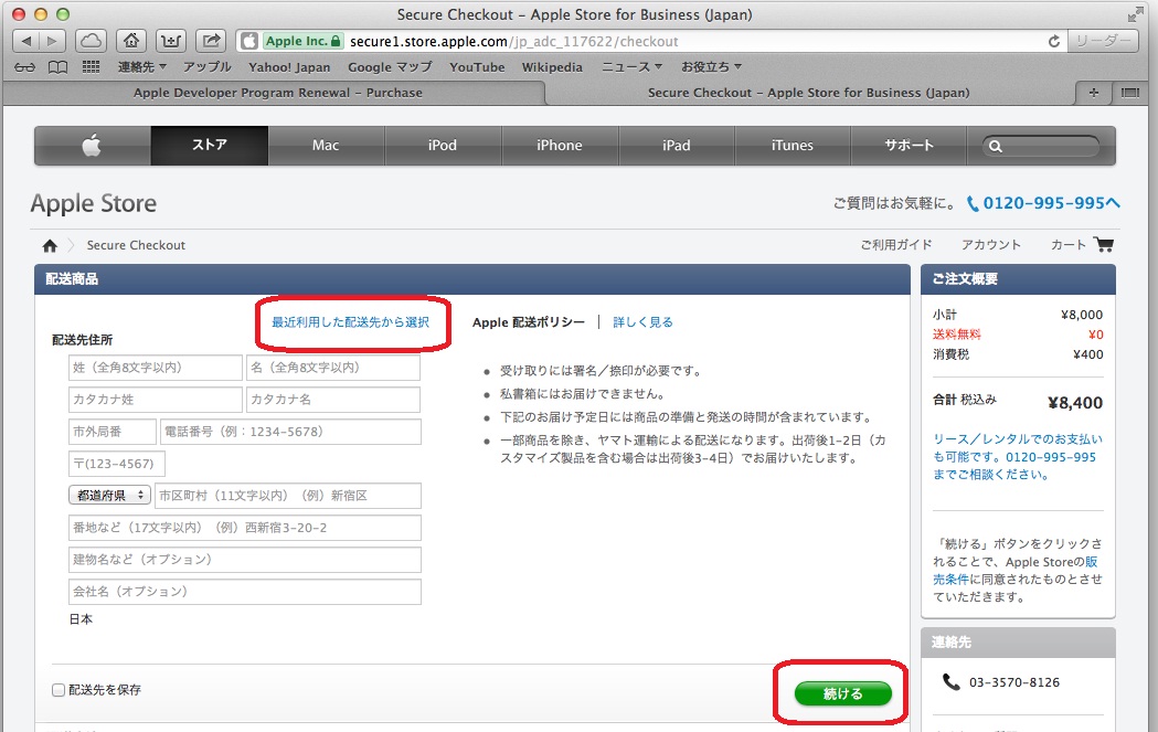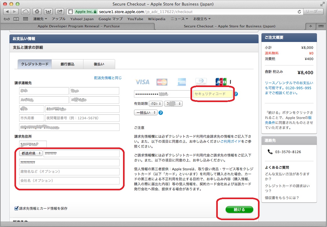 請求連絡先は、以前入力したものが表示されています。