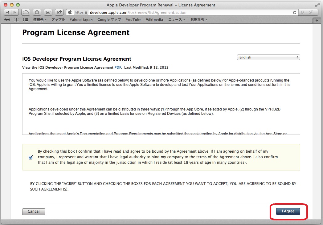 と書かれている左のチェックボックスにチェックを入れて、下の「I Agree」