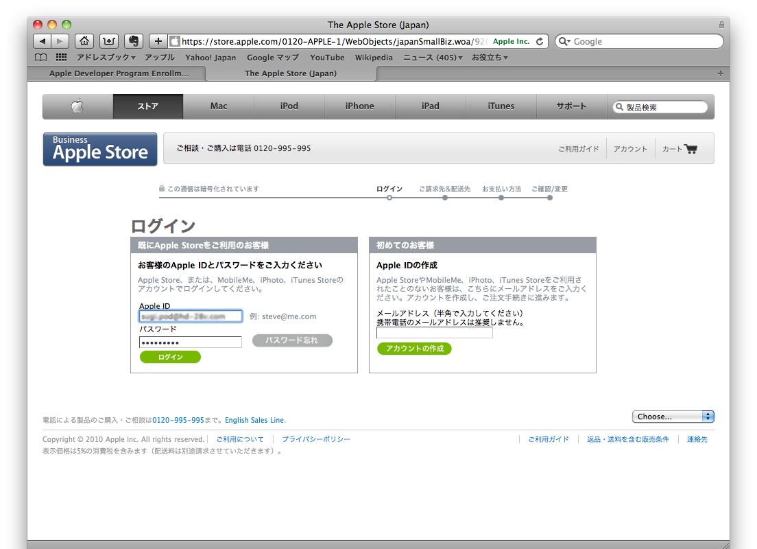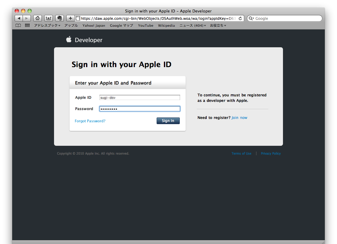 ここでは、デベロッパ用に昨日作ったApple IDとパスワードを入れます。