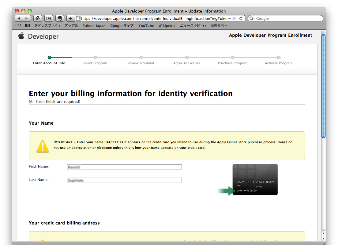 氏名は、クレジットカードに記載されている名前する必要があります。