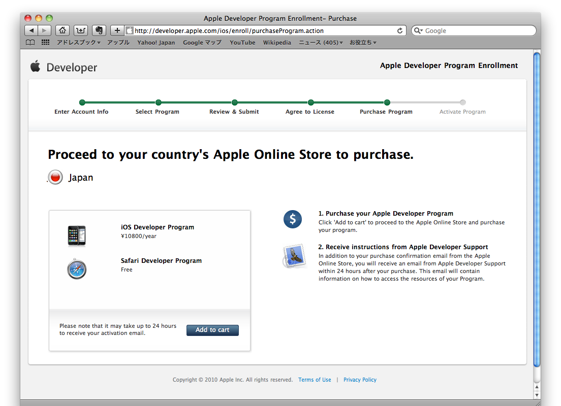 「あたなの国のアップルストアへ進み、購入してください」という画面がひらきますので、左下の「Add to cart」ボタンをクリックします。