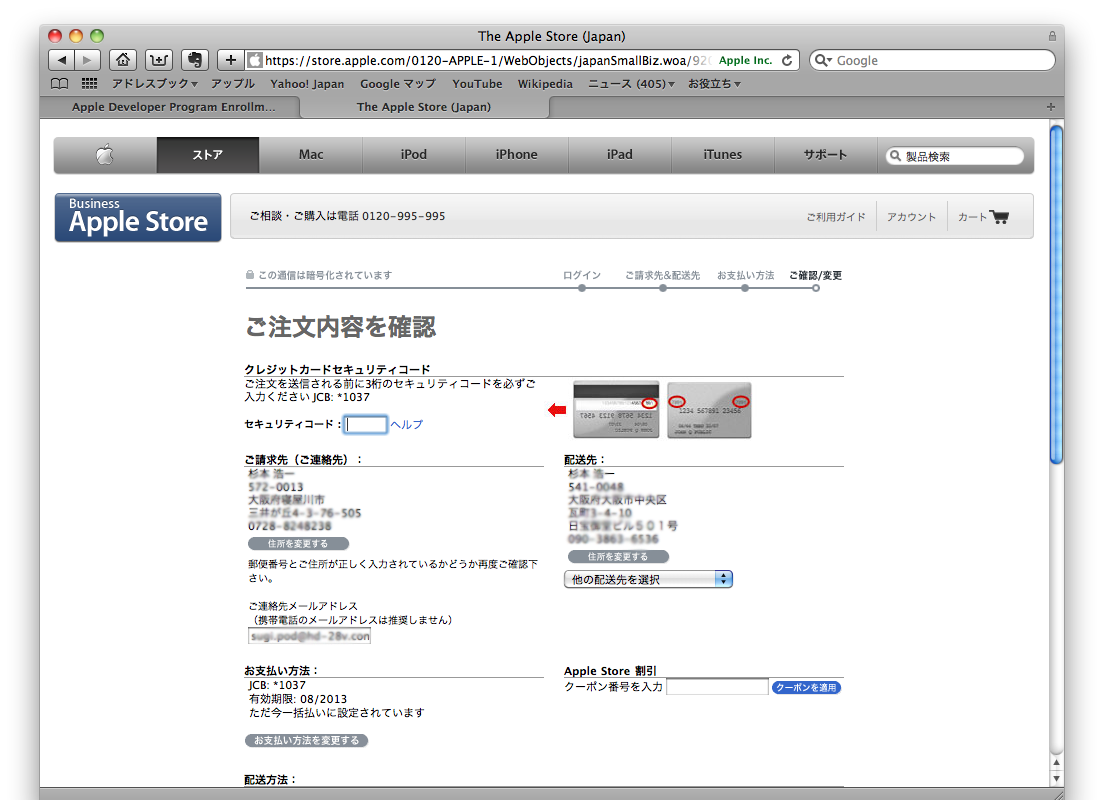 ここでは、クレジットカードセキュリティコードと連絡先メールアドレスを入力します。