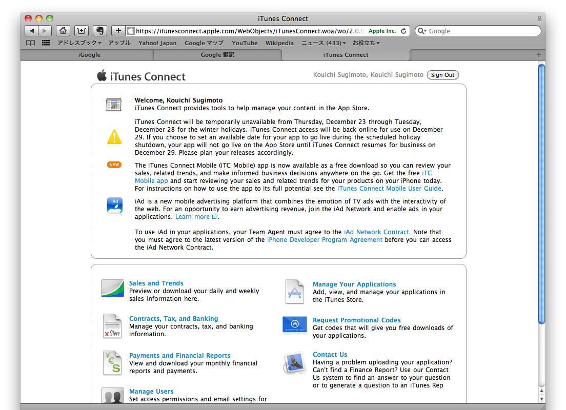 あとは、iTune ConectでiOS有料アプリケーションの契約が出来るとか、あなたのアプリケーションの情報についてセットアップや編集ができます。
