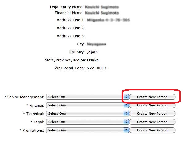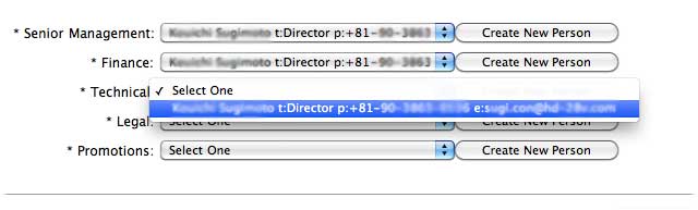 下の部分は、それぞれの役職の人を登録していくのですが、個人だとすべて同じものにしておきます。「Create New Person」で情報を入力すると、あとは「Select One」のリストボックスで選択できるようになります。