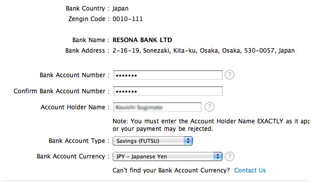 Account Holder Name: 口座の名義です。もちろんローマ字入力です。