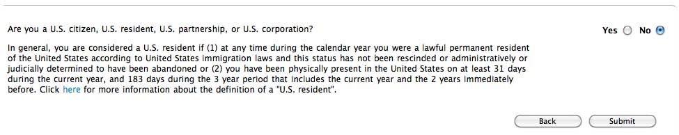 あなたはアメリカの市民・居住者・パートナー・法人ですか?と聞いてきますので、「NO」を選択し、右下の「Submit」ボタンをクリックします。