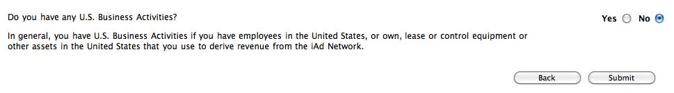 アメリカでの事業活動はありますか?と聞いてきますので、これも「NO」を選択し、右下の「Submit」ボタンをクリックします。