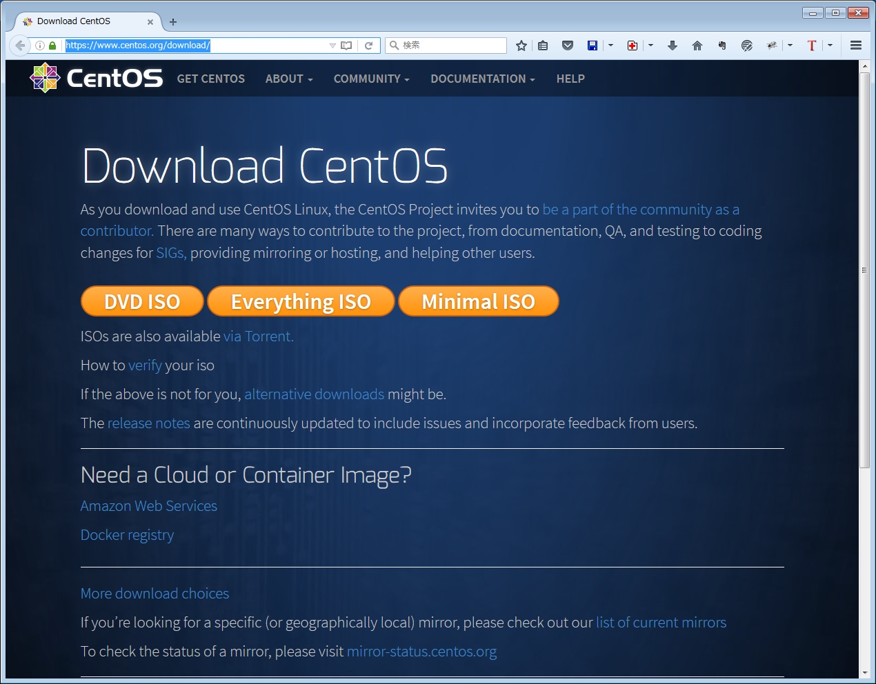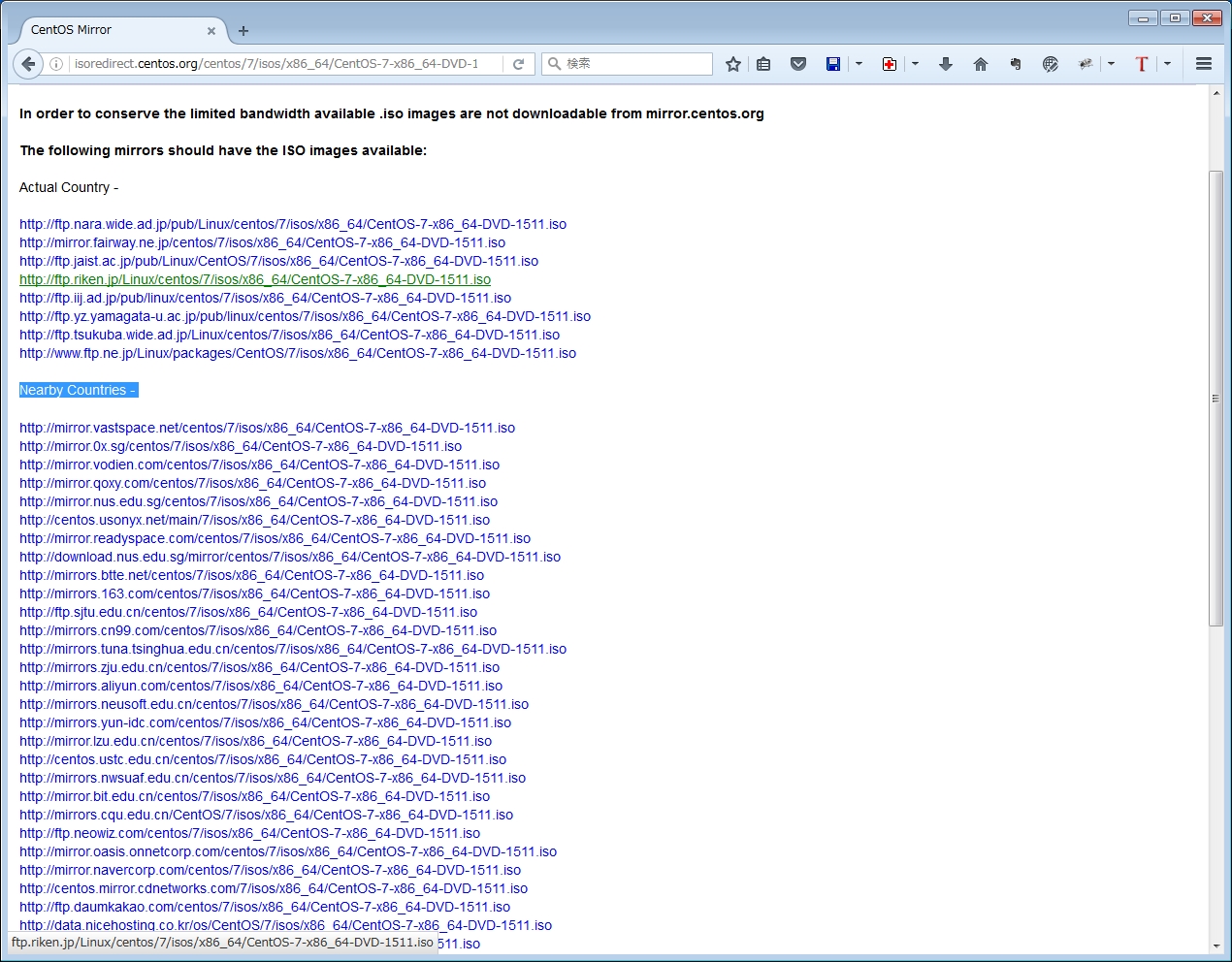 「DVD ISO」をクリックすると、ミラーサイトの一覧が表示されますので、適当なサイトを選択してダウンロードします。