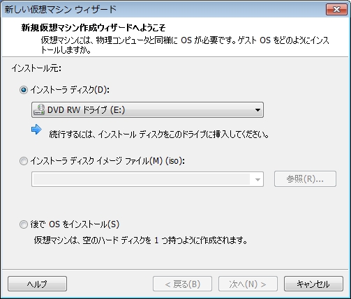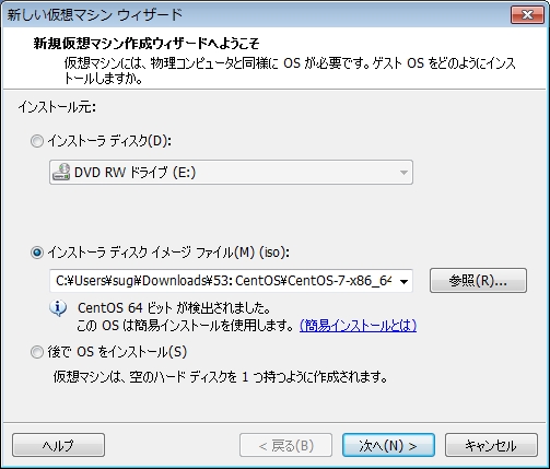 「インストーラディスクイメージファイル(M)(iso):」を選択して、[参照(R)…」より先ほどダウンロードした「CentOS-7-x86_64-DVD-1511.iso」を選択します。