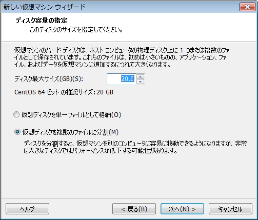 [次へ(N)>]をクリックすると、ディスク容量の指定が開きます。