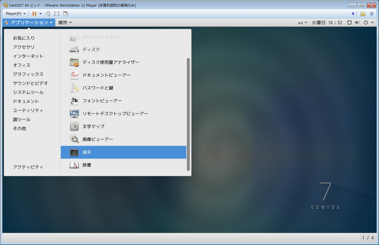左上メニューから[アプリケーション]-[ユーティリティ]-[端末]を選択し、コンソールを開きます。