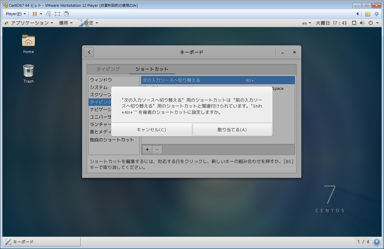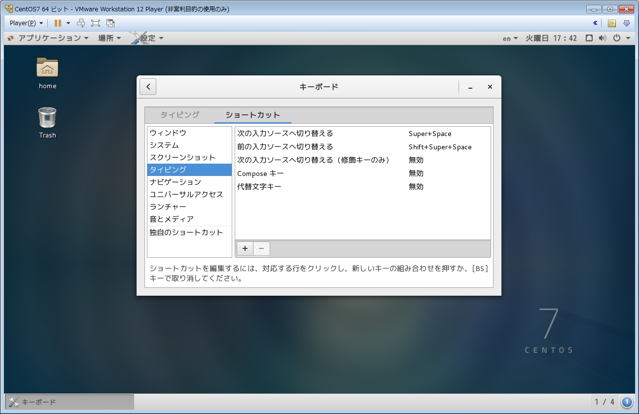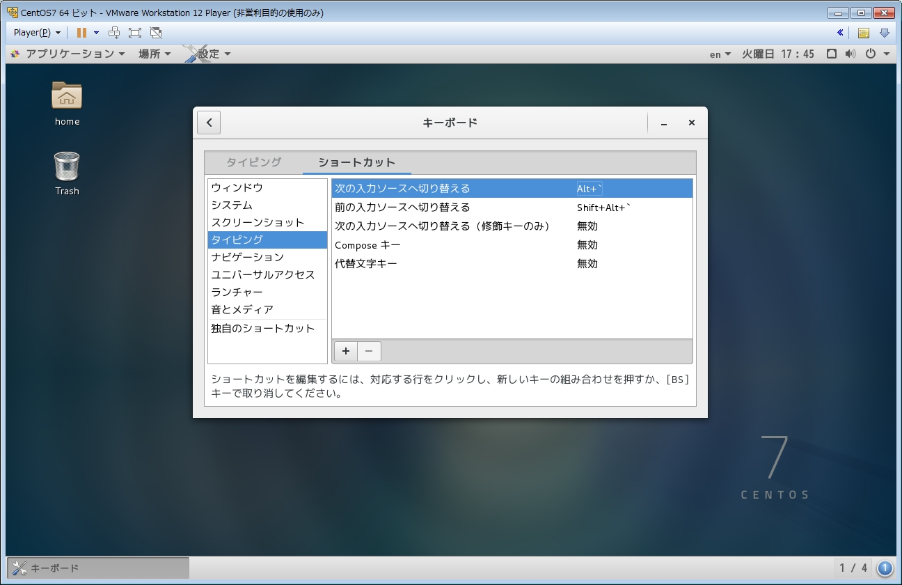 英語キーボードだと通常[Alt+`]で日本語入力の切り替えが出来るのですが、CentOSではなぜかウィンドウの切り替えになってしまいます。