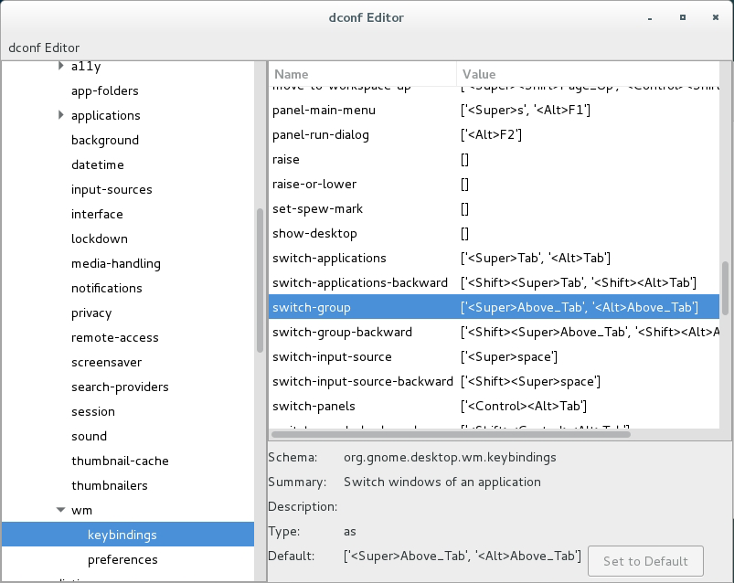 この行の値 [‘<Super>Above_Tab’,'<Alt>Above_Tab’] を [‘disabled’] に変更する。