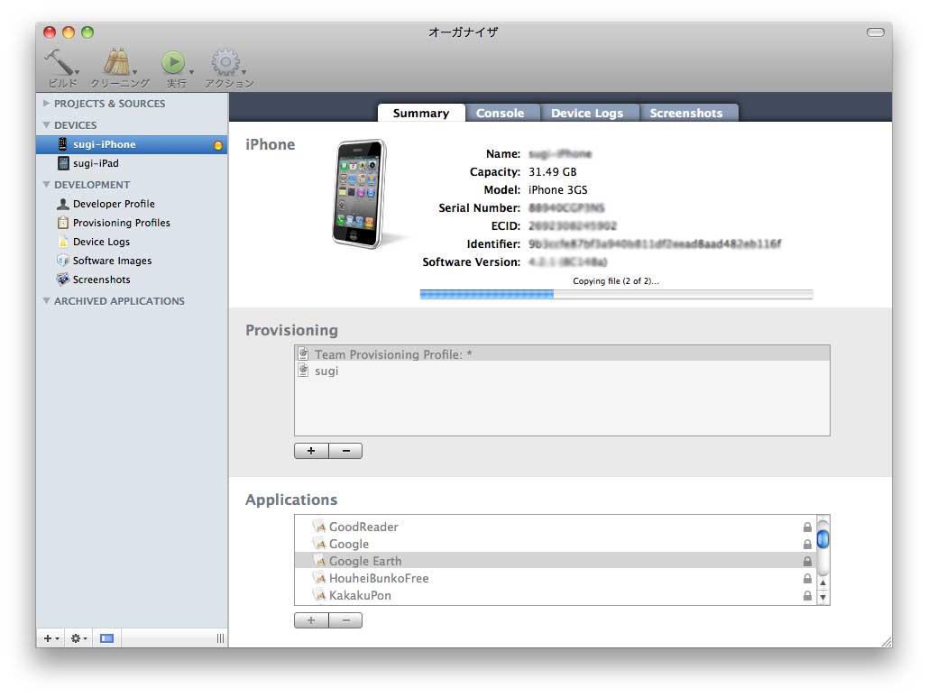 インストール後、Xcodeを起動しデバイスを繋ぐと、オーガナイザ画面が開きますので、そのまま実行してオーガナイズしておきます。