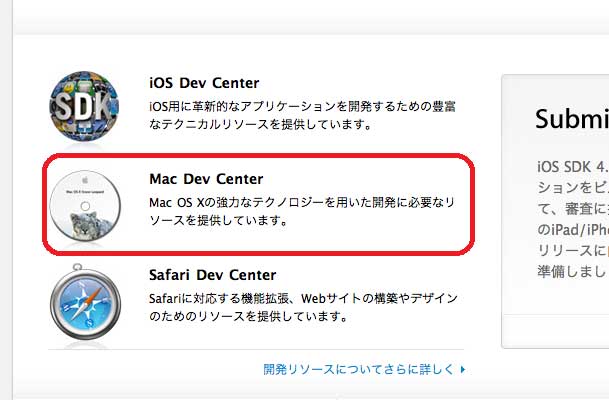 ID作成はデベロッパーページの真ん中あたりの、「Mac Dev Center」をクリックします。