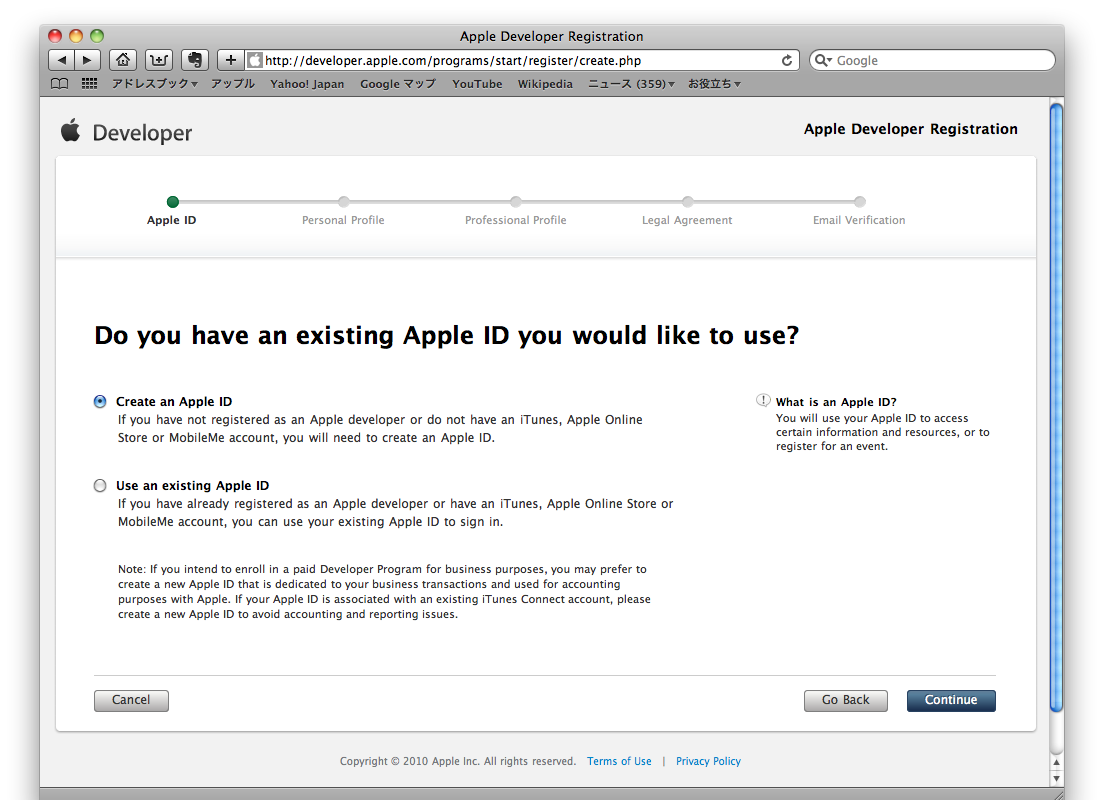 既存のIDを持っているか聞いてきます。新規作成ですので、「Create an Apple ID」を選択して、右下の「Continue」ボタンをクリックします。