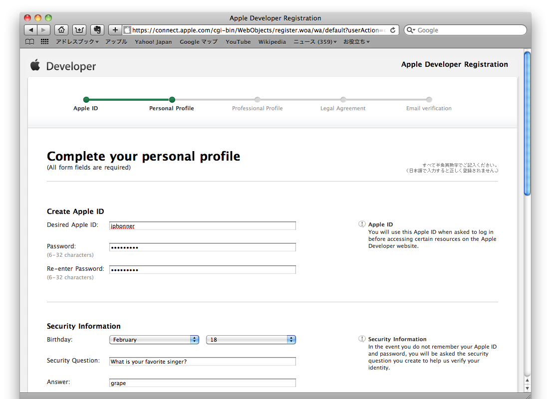 文字化けが気にならないなら、そのままでもOKみたいです。住所・氏名を半角英数で入れておけば大丈夫だという意見もありますが、都道府県はリストから選ぶので、この部分は化けてしまいます。ので、新しいIDを作ることにします。
