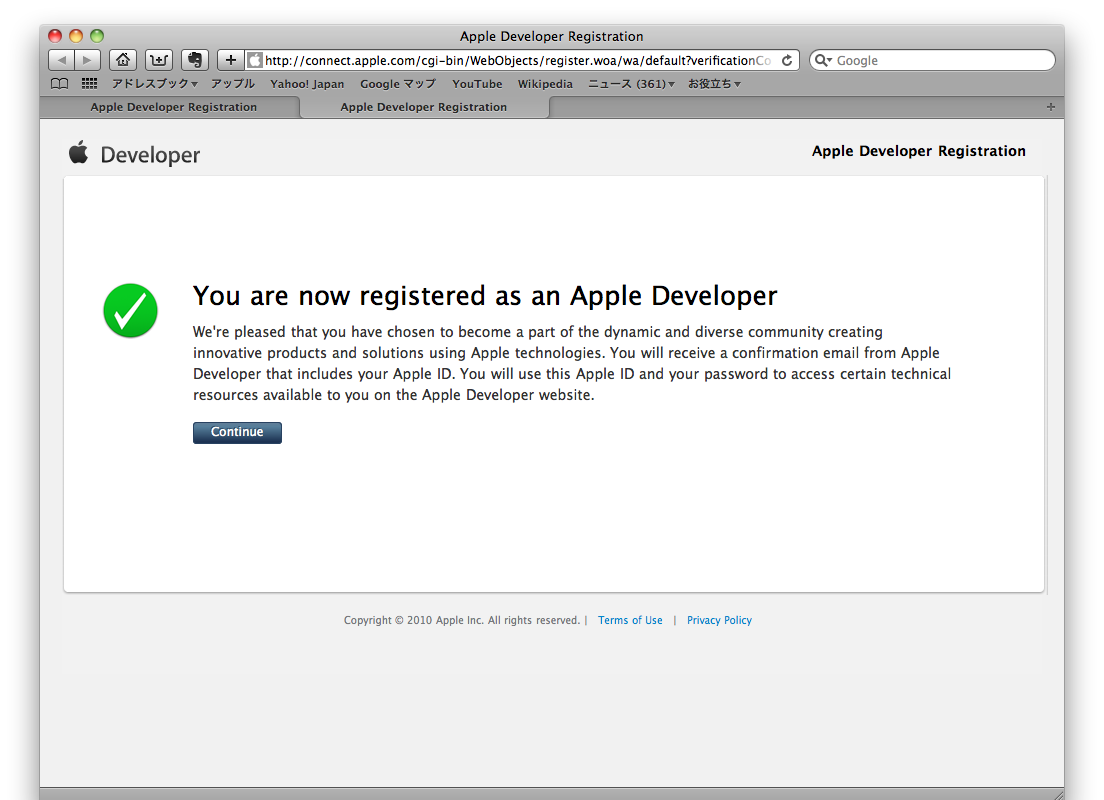 入力が終わったら右下の「Continue」ボタンをクリックします。