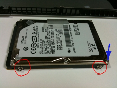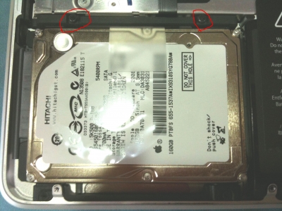 赤丸の所のネジをはずし、HDDを押さえているパーツをはずします。