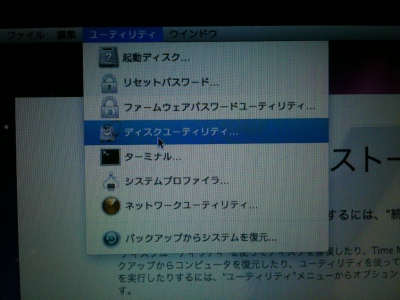 ユーティリティメニューから、ディスクユーティリティを選択します。