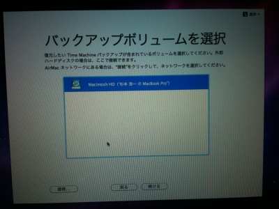 「バックアップボリュームを選択」画面が出たら、1.でバックアップをとったHDDを接続します。