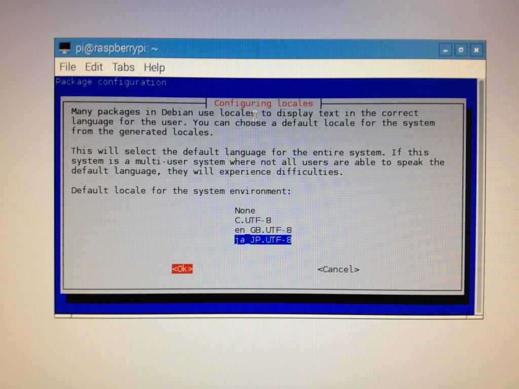 ディフォルトを選択する画面が開きますので、「ja_JP.UTF-8」を選択。