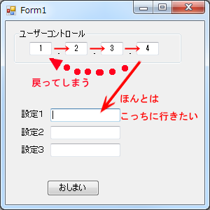 でも、このユーザーコントロールをフォームにはりつけて、リターンを押していくと、ユーザーコントロール内で、フォーカスがぐるぐる回ってしまいます。