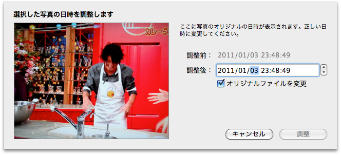 修正したい写真のイベントを選択してから、メニューの[写真]-[日時を調整…]を選択すると、下の画面が開きます。