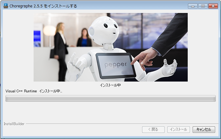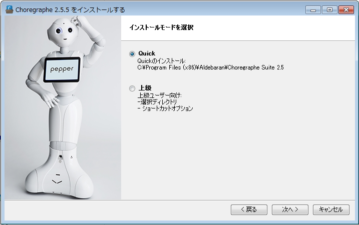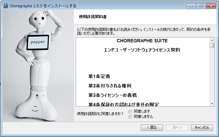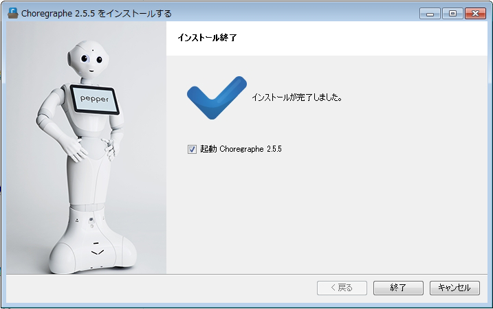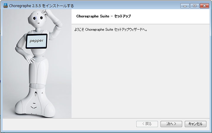 ダウンロードしたファイル「choregraphe-suite-2.5.5.5-win32-setup.exe」を実行し、画面にしたがってインストールします。